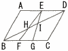 右の平行四辺形ABCDにおいて,AE=ED,BF=FG=GCである。対角線BD上の,EF,EGと交わる点をそれぞれH,I とするとき,BH:H