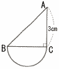 右の図は,∠Cを直角とする直角二等辺三角形ABCと辺BCを直径とする半円をつないだものであり,AC=BC=3cmである。この図形を直線BCを軸として1回転してできる立体の体積を求めよ。 |