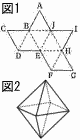 図1は,1辺の長さが6cmの正八面体の展開図です。図2は,図1の展開図を組み立ててできる正八面体です。図2の正八面体の頂点Bから,辺AJ,,JH.,EH上を通り,頂点までひもをかけます。ひもの長さが最も短くなるようにひもをかけるとき,辺 AJ上でひもがある位置をPとします。 (1) ひもの長さを求めなさい。 (2) 図2の正八面体を3点B,H.Pを通る平面で切断したとき,切り口の図形の周の長さを 求めなさい。 |