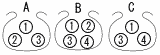 図のように,3つの袋A,B,Cがあり,袋Aの中には1,2,3の数字が1つずつ書かれた3個の玉が,袋Bの中には1,2,3,4の数字が1つずつ書かれた4個の玉が,袋Cの中には1,3,4の数字が1つずつ書かれた3個の玉が入っている。3